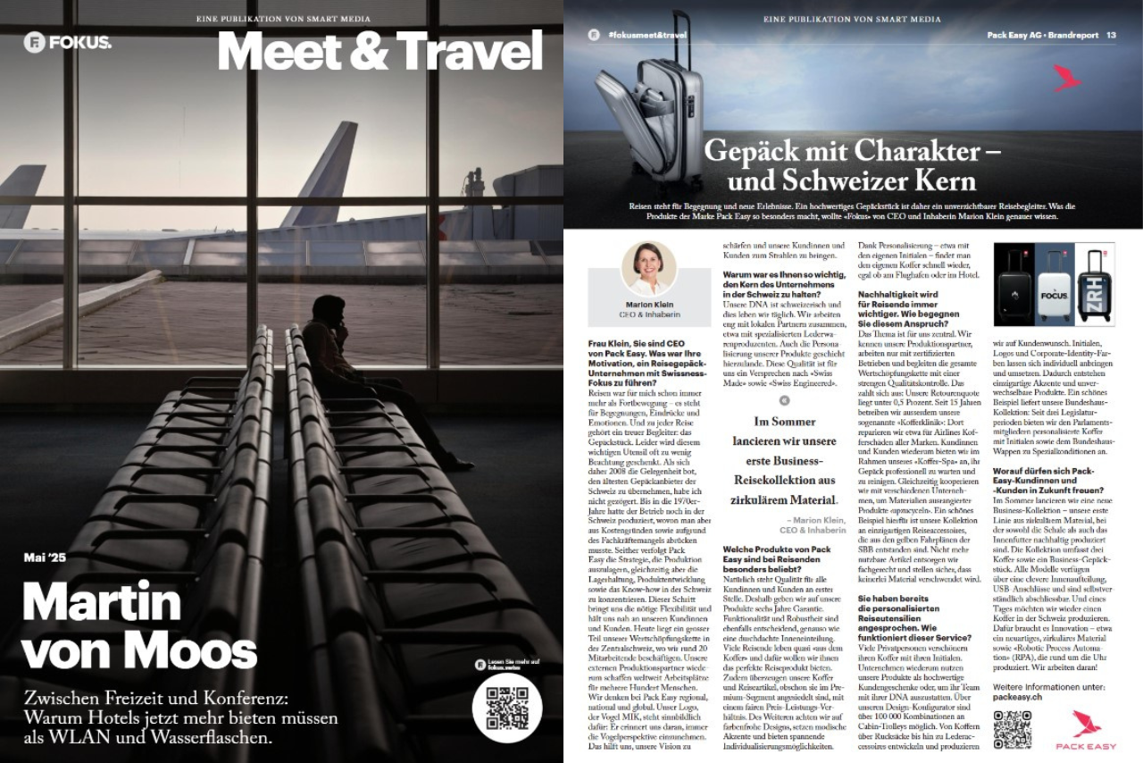 Der Brandreport im Magazin «FOKUS Meet & Travel» mit einem Interview von Marion Klein, CEO & Inhaberin von Pack Easy enthält spannende Insights über Swissness, Nachhaltigkeit und Personalisierungsmöglichkeiten bei Pack Easy und verrät zudem, auf welche Neuheit sich unsere Kunden ab Sommer 2025 freuen dürfen.