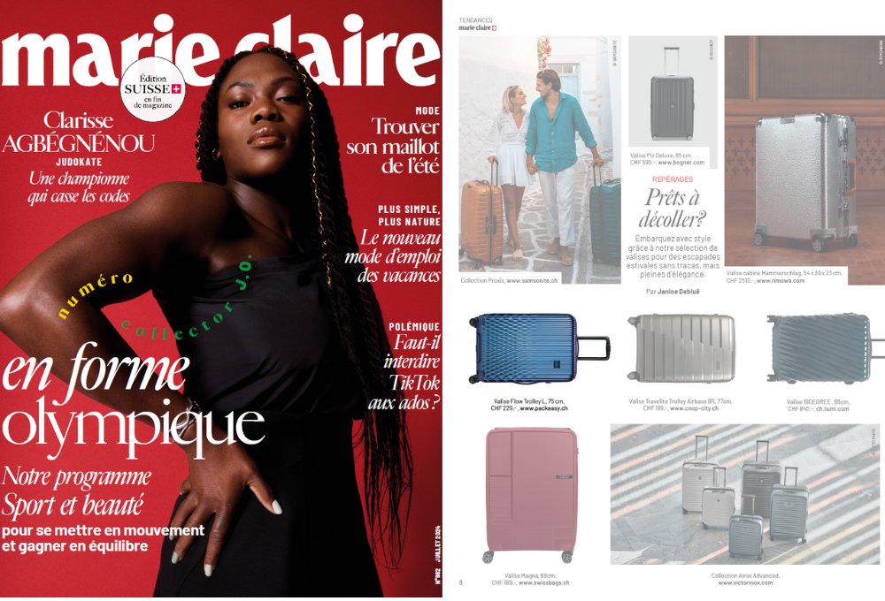 In der Juliausgabe der Marie Claire Suisse macht unser Flow-Trolley in der malerischen Farbe "Moroccan Blue" Lust auf Sommerurlaub.